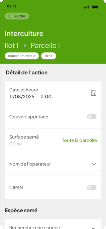 Si vous avez des parcelles en jachère, celles-ci seront automatiquement détectées par Phyz et vous disposerez de fonctionnalités spécifiques à cet état.